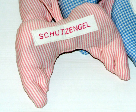 Schutzengel in Vichystoff Streifen rosa/weiß. Gefüllt ist der Schutzengel mit Lavendel und Watte, so dass er einen zarten Duft verströmt.